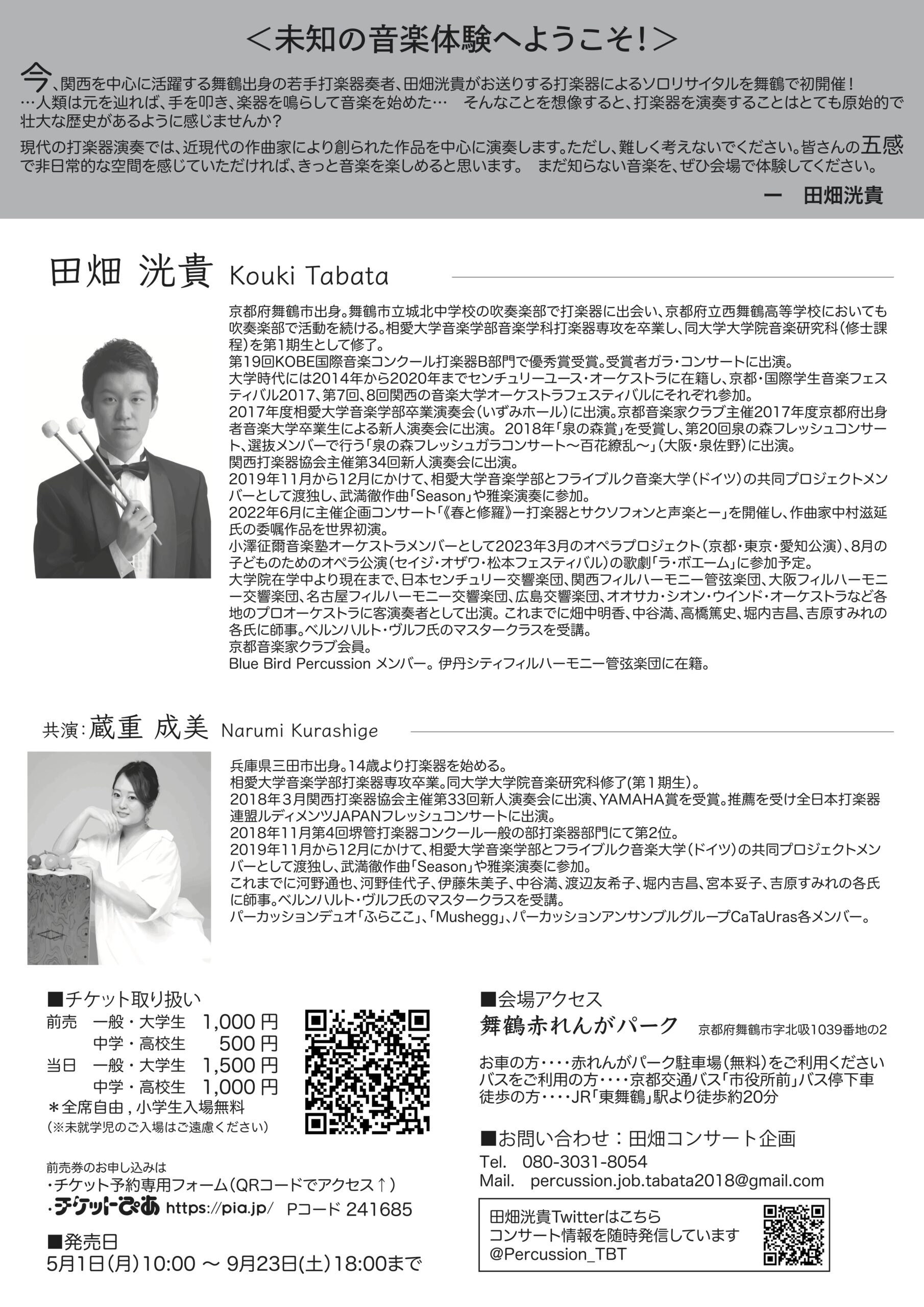 田畑洸貴パーカッションリサイタル ~Rebond ー跳ねる音、伝わる空間ー~ 開催場所赤れんがパーク2号棟 開催日2023/09/24 開催時間14:00 ~ 16:00 入場料前売 一般・大学生 1,000円 中学・高校生 500円 当日 一般・大学生 1,500円 中学・高校生 1,000円 主催田畑コンサート企画 お問い合わせTEL: 080-3031-8054 MAIL: percussion.job.tabata2018@gmail.com 概要 前の記事 次の記事