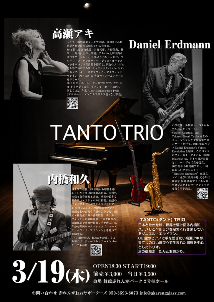 高瀬アキ コンサート 開催場所赤れんがパーク2号棟 開催日2026/03/19 開催時間OPEN 18:30 START 19:00 入場料前売り 3,000円 当日 3,500円 主催赤れんがjazzサポーターズ 前の記事 次の記事