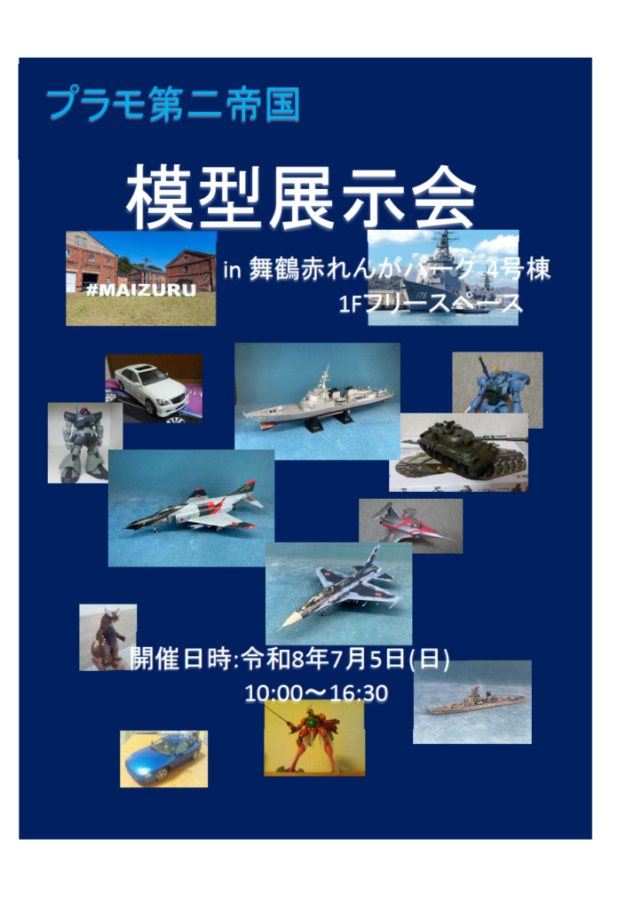 模型展示会in舞鶴 開催場所赤れんがパーク4号棟 開催日2026/07/05-2026/07/05 開催時間午前10時〜午後16時30分 入場料無料 主催プラモ第二帝国 お問い合わせプラモ第二帝国 模型展示会in舞鶴 TEL:090-3629-9887 MAIL:satoreizo@nifty.com 前の記事 次の記事