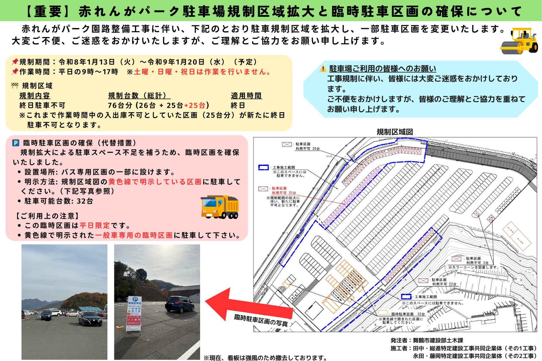 「赤れんがパーク園路整備工事」につきまして、来週 1月13日(火)より駐車場の規制区域を拡大させていただきます。