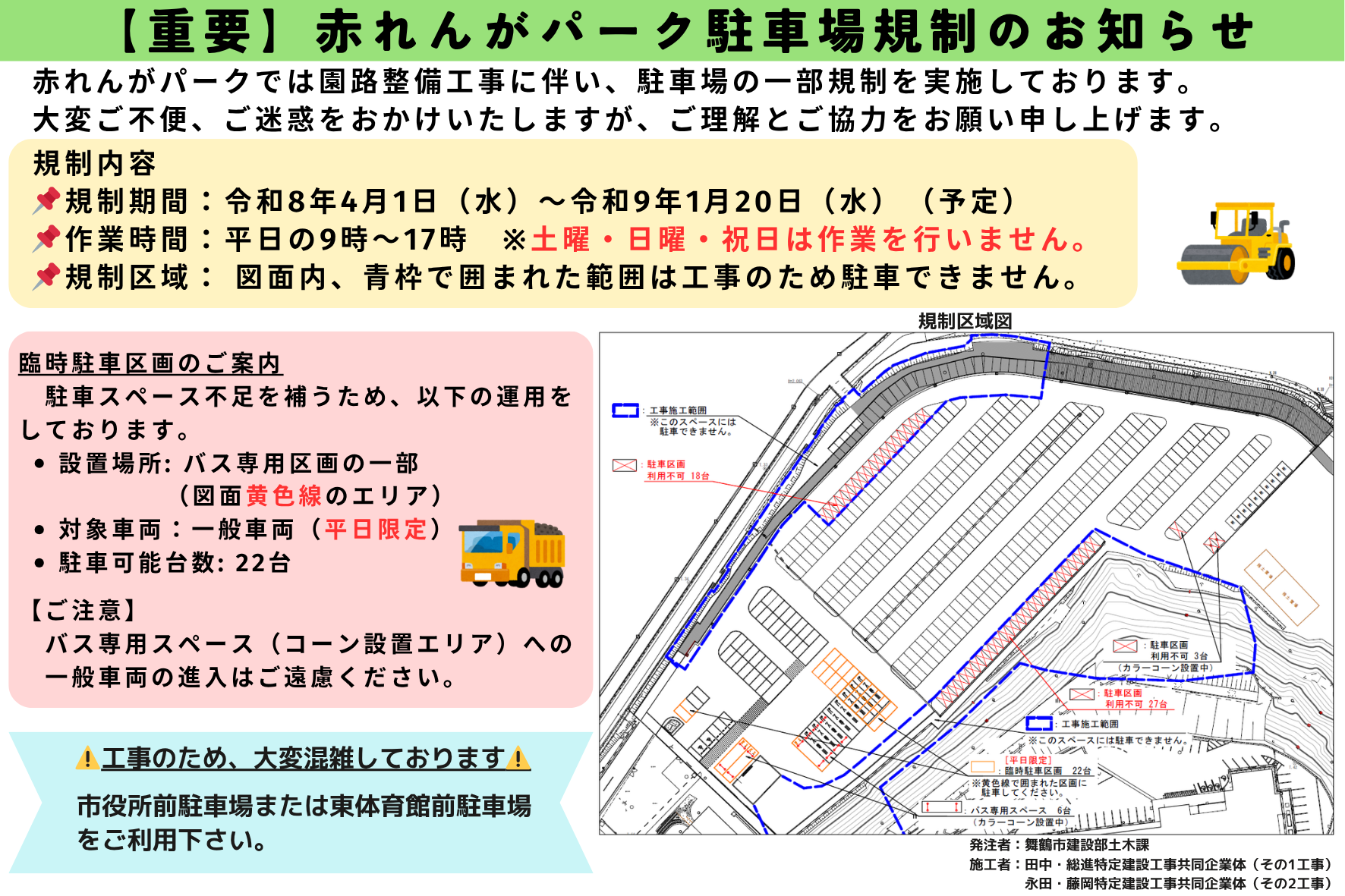 ■ その他:工事のため、駐車場内が大変混雑しております。市役所前駐車場または東体育館前駐車場をご利用ください。